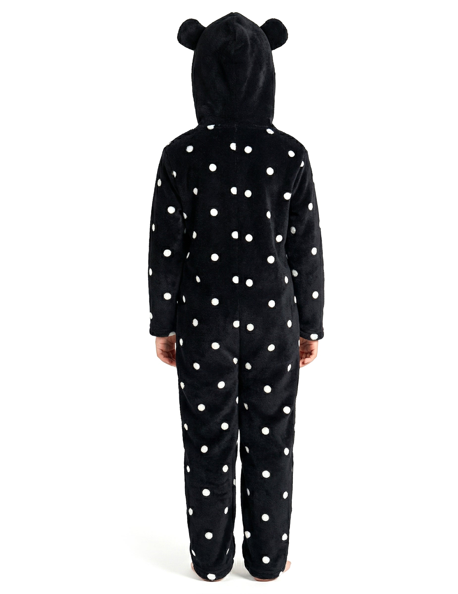 Kombinezon je crne boje s bijelim točkicama, ima mekanu teksturu i prednji patentni zatvarač koji olakšava oblačenje. Rukavi i nogavice imaju isti uzorak, što stvara vizualno skladan izgled.