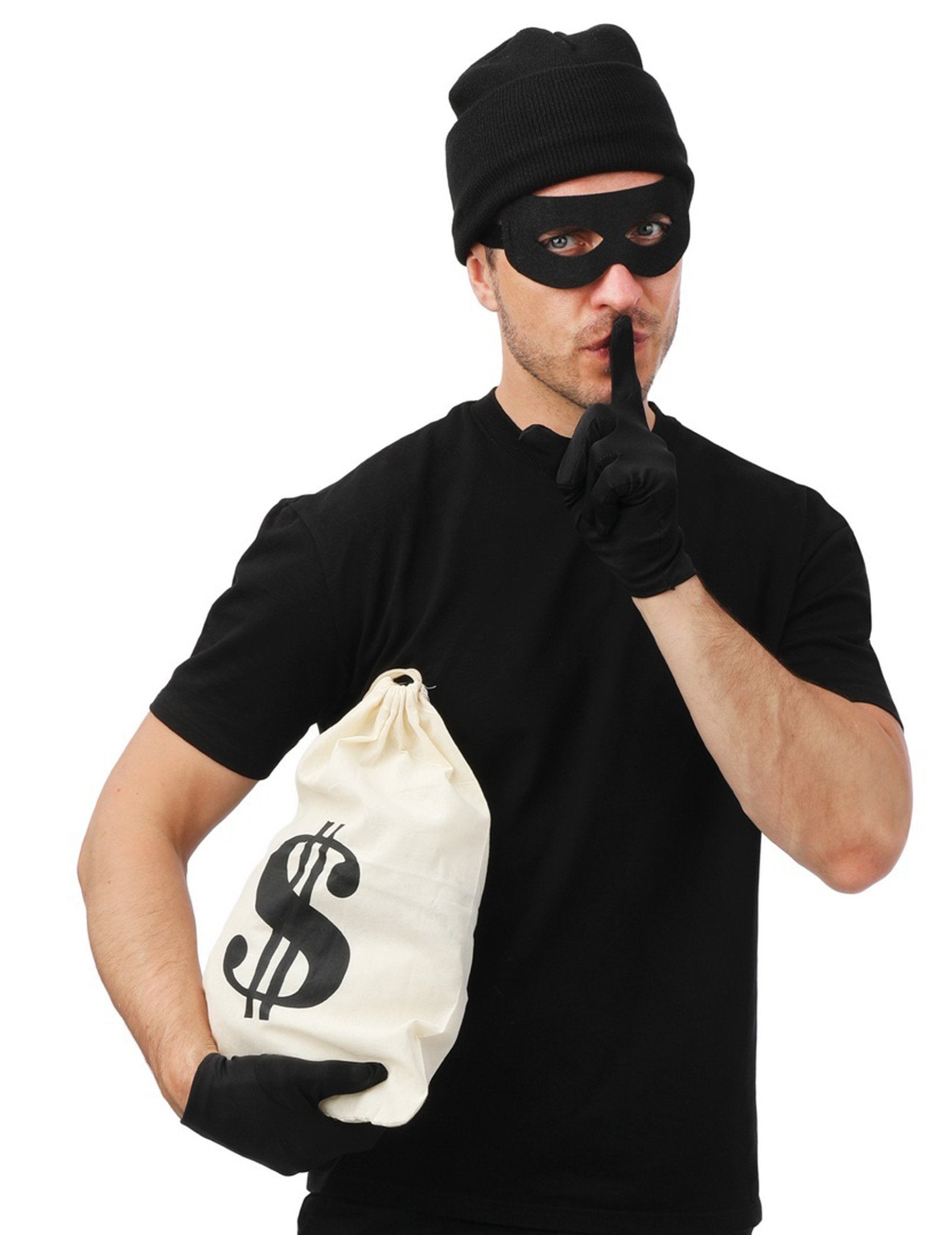 Le sac clair imprimé d'un dollar ajoute un détail visuel fort, directement associé à l’univers du cambriolage.