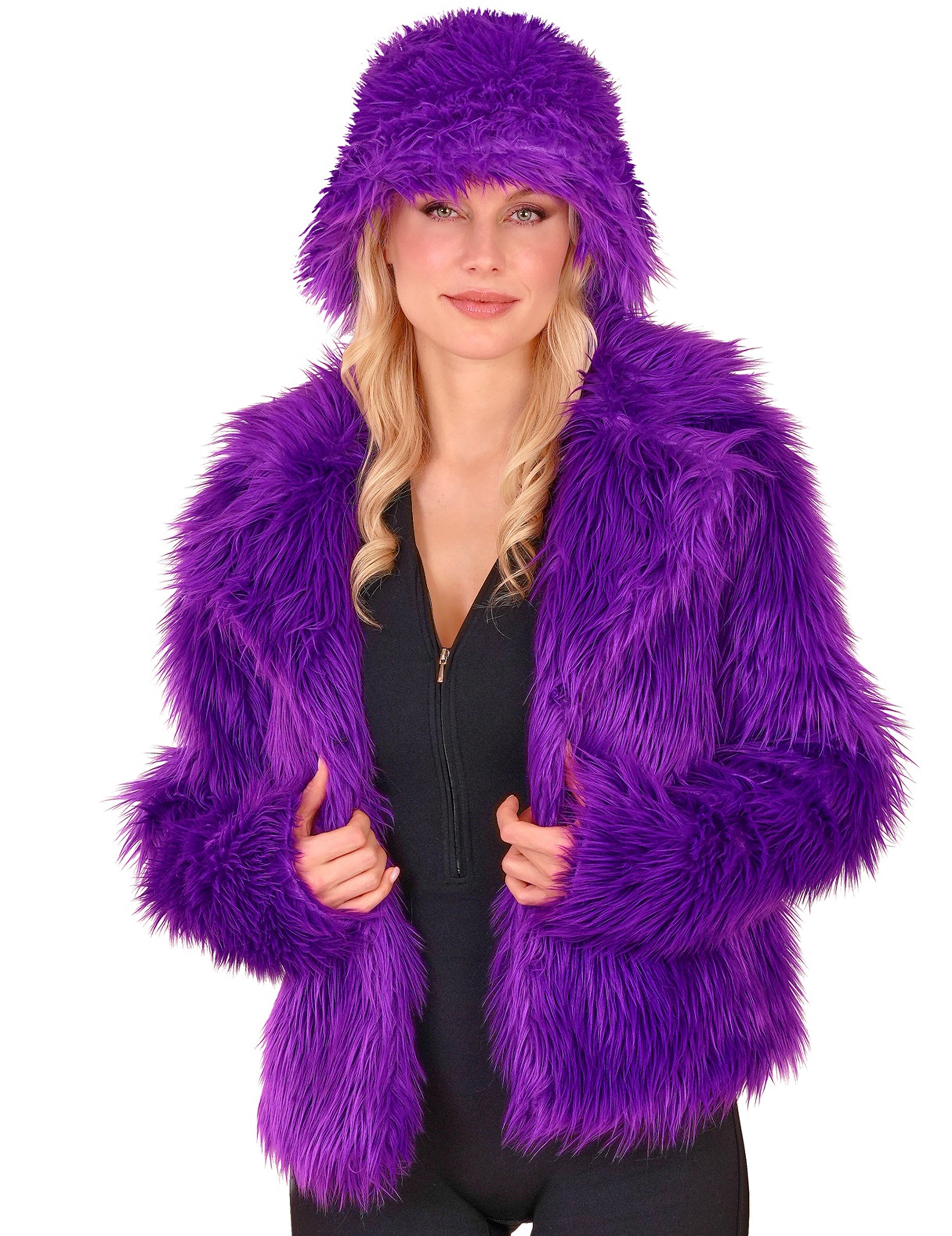 Ce manteau présente une coupe droite avec un col ouvert et un revêtement intégral en fausse fourrure violette. Les manches longues reprennent la même texture pour une silhouette homogène. Sa longueur arrive environ au niveau des hanches, ce qui permet de le porter facilement par-dessus une robe, une combinaison ou un costume festif.
